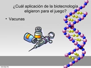 Este documento presenta un juego desarrollado por Juan Jose Santana del Liceo Villarreal usando el programa Alice 2.2 de la Universidad de Carnegie Mellon. El juego cubre la aplicación de las vacunas en la biotecnología, destacando la importancia de las aplicaciones biotecnológicas en la vida diaria y sus implicaciones, aunque no especifica los desafíos encontrados en su desarrollo.