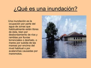 Este documento resume las principales causas y zonas afectadas por las inundaciones en España. Las inundaciones son causadas principalmente por lluvias intensas, deshielos, marejadas ciclónicas y maremotos. Las áreas más propensas a inundaciones son la cuenca norte, la región mediterránea y los Pirineos Orientales. Además, se mencionan algunas de las inundaciones más importantes en la historia de España y medidas para prevenir y defenderse de futuras inundaciones.