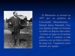 El baloncesto fue inventado en 1879 por James Naismith como un deporte de invierno que se podía jugar bajo techo. Consiste en lanzar un balón esférico a una canasta a cada extremo de una cancha. Originalmente se jugaba con 5 jugadores por equipo y las primeras reglas prohibían correr con el balón o golpearlo con el puño. Actualmente se juega en 4 cuartos de 10 minutos cada uno y existen diferentes valores de puntos dependiendo de la zona de lanzamiento. El partido es controlado por árbitros y oficiales