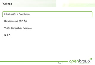 El documento proporciona una visión general del ERP ágil de Openbravo. Resalta que es flexible y fácil de personalizar, con una interfaz de usuario más productiva en un entorno web listo para la nube y a un precio asequible. Cubre funcionalidades como finanzas, compras, almacén, producción, ventas y contabilidad de proyectos de manera modular, con potentes herramientas de automatización, seguridad y análisis de datos.