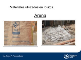 El documento describe los materiales de construcción comúnmente usados en Iquitos como arena, cemento y ladrillo. También describe tres tipos comunes de viviendas y los pasos del proceso de construcción incluyendo encofrado, mezcla de concreto, acarreo de materiales, asentado de ladrillos, vaciado de columnas, entablado de pisos, dinteles, vigas de amarre y unión de columnas y muros.
