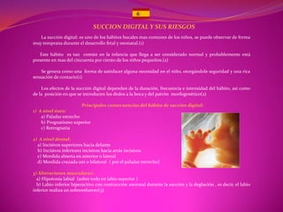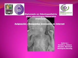 Este documento presenta información sobre un diplomado en odontopediatría para odontólogos generales que se llevará a cabo en Valencia. Incluye detalles sobre la succión digital y sus riesgos a nivel óseo, dental y muscular. Proporciona estrategias de búsqueda en internet para obtener más información sobre este tema así como una bibliografía de las fuentes consultadas.
