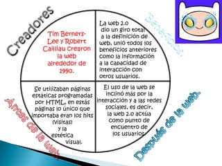 La web 2.0 permite a los usuarios interactuar y colaborar como creadores de contenido a diferencia de las páginas web tradicionales que solo brindan información. Facilita el uso de blogs, wikis, redes sociales y almacenamiento en línea para compartir documentos, fotos, videos y más. El término web 2.0 se refiere a aplicaciones que aprovechan la inteligencia colectiva para ofrecer servicios interactivos en la red.