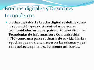 La brecha digital se refiere a la separación entre personas que usan tecnologías de información y comunicación como parte de su vida diaria y aquellos que no tienen acceso o conocimiento de cómo usarlas. Los desechos tecnológicos como baterías y aparatos electrónicos contienen sustancias peligrosas que contaminan el agua y el medio ambiente, por lo que es importante desecharlos de forma responsable en puntos de reciclaje designados.