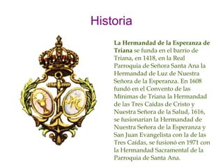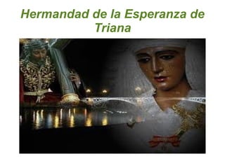 La Hermandad de la Esperanza de Triana se fundó en 1418 en Sevilla. Procesiona con dos pasos principales, el Stmo. Cristo de las Tres Caídas y Nuestra Señora de la Esperanza bajo palio. La cofradía cuenta con diversas insignias y detalles de gran valor artístico en plata y bordados.