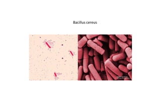 Bacillus cereus es una bacteria Gram positiva que causa dos tipos de intoxicación alimentaria, el síndrome emético y el síndrome diarréico, debido a las toxinas que produce. El documento revisa las toxinas producidas por B. cereus y cómo están relacionadas con las intoxicaciones alimentarias, así como otros factores que explican la virulencia de esta bacteria, con el objetivo de profundizar en el conocimiento sobre esta bacteria y sus implicaciones para la salud humana.