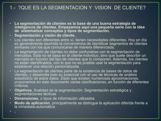 La segmentación de clientes consiste en agrupar a los clientes en segmentos con características similares para comunicarse con ellos de manera diferenciada. Existen dos tipos principales de segmentación: la segmentación estratégica, que permite establecer objetivos centrados en el cliente, y la segmentación táctica, que se enfoca en la optimización del marketing a través de campañas como la retención, recuperación, venta cruzada y captación de nuevos clientes.