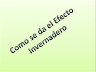El efecto invernadero es un fenómeno natural causado por gases en la atmósfera como el vapor de agua y el dióxido de carbono, los cuales retienen parte de la energía del Sol manteniendo la temperatura de la Tierra habitable. Algunos gases responsables del efecto invernadero son el metano y el óxido nitroso, cuyas emisiones han aumentado debido a la actividad humana, lo que puede causar consecuencias negativas como el calentamiento global. Protocolos internacionales buscan reducir las emisiones de estos gases