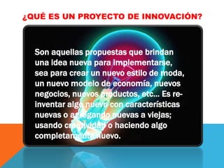 Un proyecto de innovación propone una nueva idea para crear algo novedoso como un estilo de moda, modelo económico, negocio o producto. La innovación puede ser de productos o procesos, siendo la primera la introducción de un bien o servicio nuevo y la segunda la implementación de un proceso de producción o gestión mejorado.