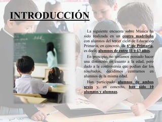 Este documento presenta los resultados de una encuesta sobre música realizada a 10 estudiantes de entre 11 y 13 años. La mayoría de los estudiantes les gusta la música pop, reggaetón y escuchan música en ambos idiomas inglés y español. Prefieren la música de series y películas sobre la música de radio. Sus gustos musicales son independientes de los de sus padres.