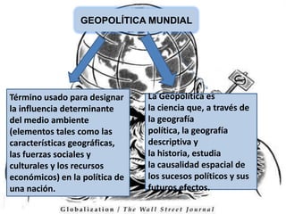 Este documento presenta un tema sobre geopolítica mundial. Define la geopolítica como la influencia del medio ambiente en la política de una nación, incluyendo factores geográficos, sociales, culturales y económicos. Explica que la geopolítica estudia la causalidad espacial de los sucesos políticos y sus efectos futuros. Finalmente, señala que los intereses fundamentales de la geopolítica mundial incluyen el acceso a recursos energéticos y otros recursos clave, así como mantener la vanguardia tecn