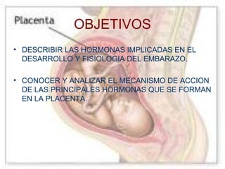 Este documento describe las principales hormonas producidas en la placenta durante el embarazo, incluyendo la gonadotropina coriónica humana (hCG), el lactógeno placentario (hPL) y los estrógenos. Explica sus funciones, mecanismos de acción, regulación y concentraciones en el embarazo, así como las alteraciones que pueden ocurrir.