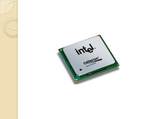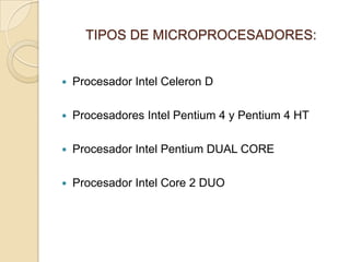 Este documento describe cuatro tipos de microprocesadores: el Intel Celeron D, los procesadores Intel Pentium 4 y Pentium 4 HT, el procesador Intel Pentium DUAL CORE y el procesador Intel Core 2 DUO. Se proporciona información sobre las características y especificaciones técnicas de cada uno.