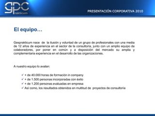 Gesprakticum es una consultora de recursos humanos fundada por un grupo de profesionales con experiencia en el sector. La compañía ofrece servicios de selección, evaluación, formación, desarrollo y consultoría para ayudar a las organizaciones a crecer mediante la incorporación del talento y la excelencia. Gesprakticum se guía por principios como la ilusión, la pasión, la confianza y la innovación para crear soluciones de calidad e impulsar el desarrollo de las personas.