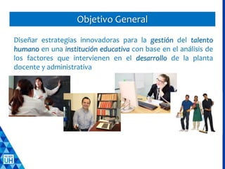 El documento describe estrategias para la gestión del talento humano en instituciones educativas. Presenta cinco temas principales: 1) el valor estratégico del factor humano y objetivos de la gestión del talento, 2) procesos clave como la selección y evaluación de personal, 3) formación y liderazgo educativo, 4) bienestar laboral, y 5) evaluación del desarrollo del talento humano. El objetivo general es diseñar estrategias innovadoras para gestionar el talento docente y administrativo que mejoren la calidad de