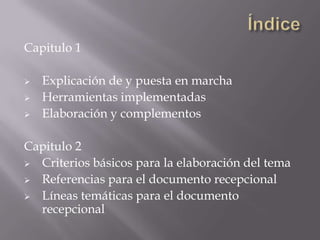El documento describe estrategias para desarrollar un documento recepcional para el trabajo de recepción, incluyendo la explicación y puesta en marcha de herramientas, la elaboración y complementos. También presenta criterios básicos como tener claro el tema, precisarlo y analizarlo, así como líneas temáticas potenciales como procesos de enseñanza y aprendizaje o dinámica escolar. El documento recepcional se basa en conocimientos y experiencias adquiridas a lo largo de la licenciatura en educación especial.