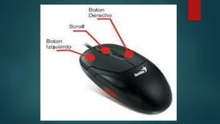 El documento describe las funciones básicas de los botones y teclas de un computador. Explica que el botón derecho muestra un menú contextual dependiendo del archivo seleccionado, el botón izquierdo se usa para seleccionar y abrir archivos y aplicaciones, y la rueda se usa para desplazarse verticalmente en documentos. También cubre el uso de teclas de función, Esc, y teclas modificadoras como Ctrl, Alt y Shift para realizar acciones específicas.