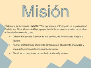 El documento describe el Sistema Universitario UNIMINUTO, el cual agrupa instituciones que comparten un modelo universitario innovador con el objetivo de ofrecer educación superior de alta calidad, formar profesionales éticamente orientados y construir un país justo y en paz. El documento también indica que para el 2012, UNIMINUTO será reconocido por las vivencias espirituales en el ámbito universitario, su contribución al desarrollo del país a través de la educación, la calidad de sus programas académicos y