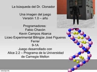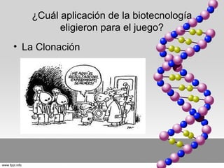 El documento presenta un resumen de un juego educativo desarrollado por dos estudiantes sobre la clonación. El juego fue creado con el programa Alice y busca explicar conceptos sobre esta aplicación de la biotecnología. Los desarrolladores describen que lo más difícil fue seguir el proceso de manera secuencial aunque lograron completarlo con paciencia.