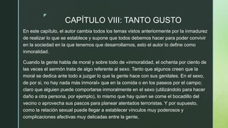 El autor discute cómo la sociedad a menudo ve el sexo como inmoral cuando en realidad no lo es. El sexo solo es inmoral cuando se usa para dañar a otros, al igual que comerse el sándwich de alguien o planear ataques terroristas. La verdadera inmoralidad es el miedo al placer que sienten las personas. El placer nos puede distraer de vivir, por lo que las sociedades han racionado los placeres a través de tabúes y restricciones. Sin embargo, el uso moderado del placer enriquece