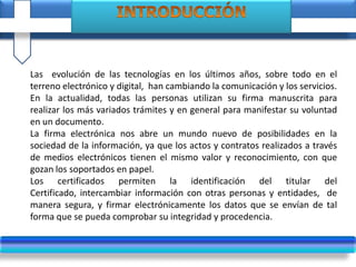 El documento habla sobre la firma electrónica y los certificados digitales. Explica que los certificados permiten la identificación segura de personas y entidades en internet y la firma electrónica de documentos de forma que se garantice su integridad y autenticidad. También indica que los certificados son emitidos por autoridades de certificación reconocidas y ofrecen garantías como la autenticidad, confidencialidad e integridad de la información intercambiada.