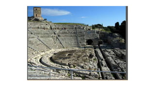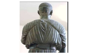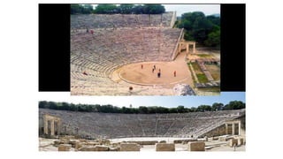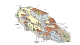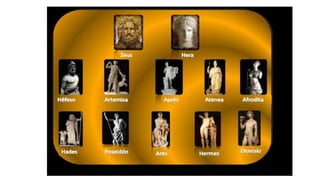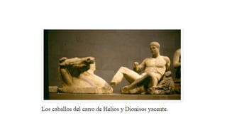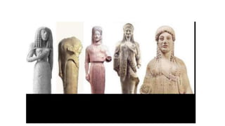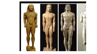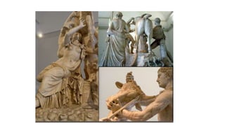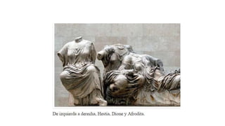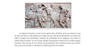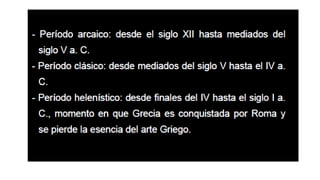 Las culturas prehelénicas en Grecia incluyeron la civilización cretense y micénica entre el segundo milenio y el 1200 a.C. La civilización griega luego floreció entre los siglos V y IV a.C., desarrollando importantes obras arquitectónicas como el Partenón y templos, y esculturas como el Doríforo, Atenea Partenos y frontones del templo de Zeus en Olimpia. La escultura griega luego continuó evolucionando durante el período helenístico con obras como la Victoria de Samotrac
