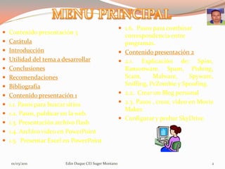 Este documento presenta un proyecto en PowerPoint sobre el uso de herramientas de presentación y sitios web. Se describen los pasos para buscar sitios en Internet, publicar páginas web, y presentar archivos y hojas de cálculo en PowerPoint. También explica conceptos como Spim, malware y cómo crear un blog y video. El objetivo es aplicar conocimientos de PowerPoint y familiarizarse con herramientas de Internet.