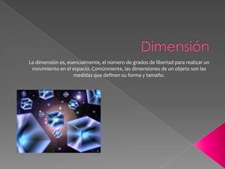 DimensiónLa dimensión es,esencialmente, el número de grados de libertad para realizar un movimiento en el espacio. Comúnmente, las dimensiones de un objeto son las medidas que definen su forma y tamaño.