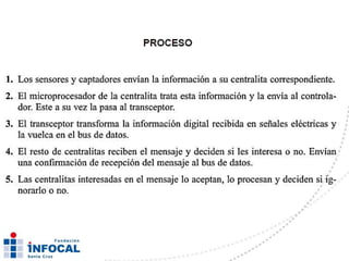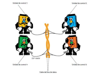 Este documento describe los componentes principales de un sistema CAN-Bus, incluyendo el controlador, transceptor, cables del bus, y resistencias terminales. Explica que el sistema funciona como un sistema multi-maestro donde cualquier nodo puede iniciar una transmisión y que utiliza un proceso de arbitraje para determinar la prioridad cuando hay colisiones. También describe brevemente el protocolo de enlace de datos utilizado para la transmisión.