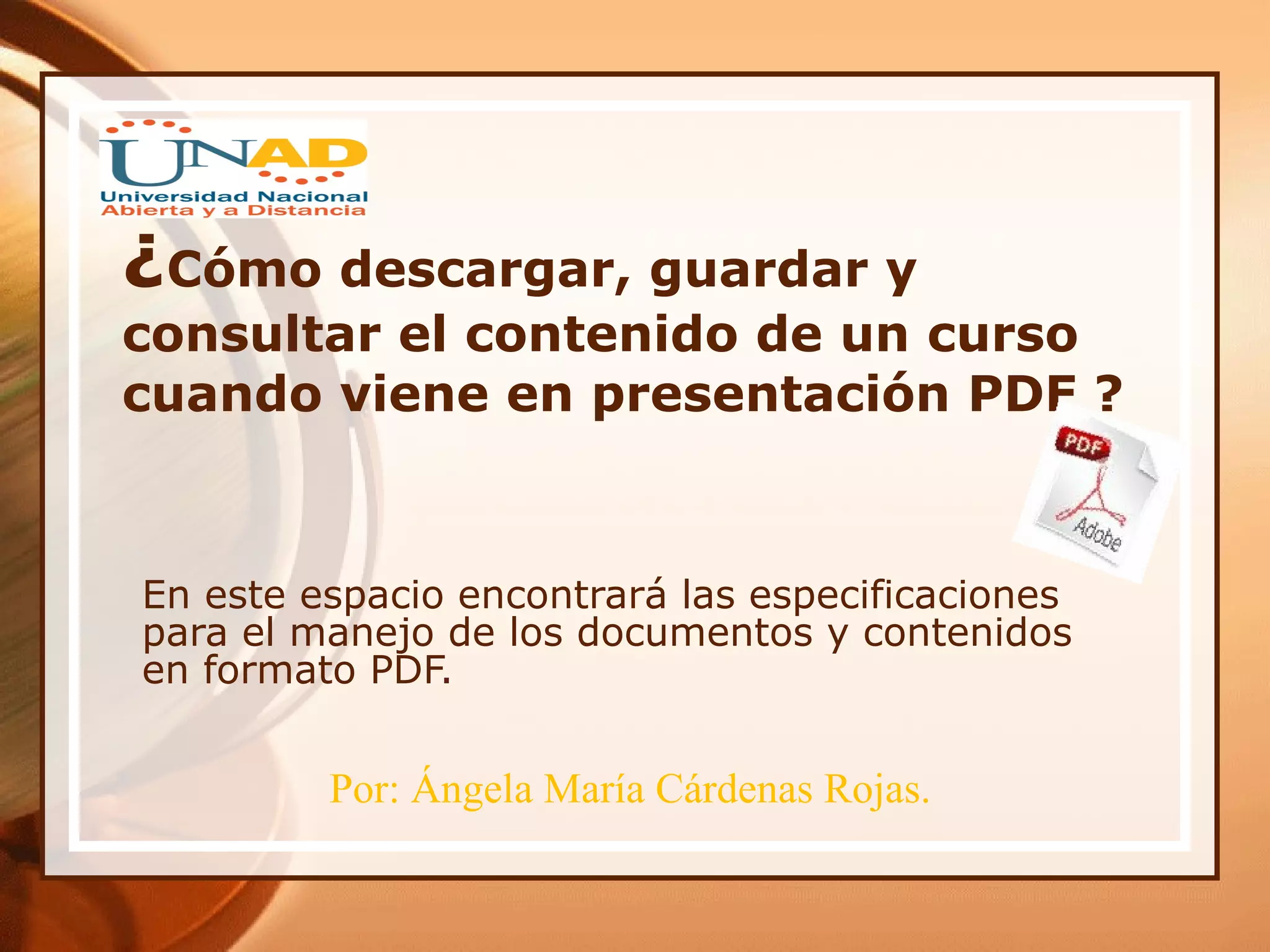 Este documento proporciona instrucciones sobre cómo descargar, guardar y ver archivos en formato PDF. Explica que PDF es un formato común para compartir información de manera fija y portable. Detalla los pasos para guardar un archivo PDF en la computadora y cómo verlos usando el lector de PDF gratuito de Adobe. También resalta las ventajas de este formato como su peso ligero y capacidad de mantener el formato original.