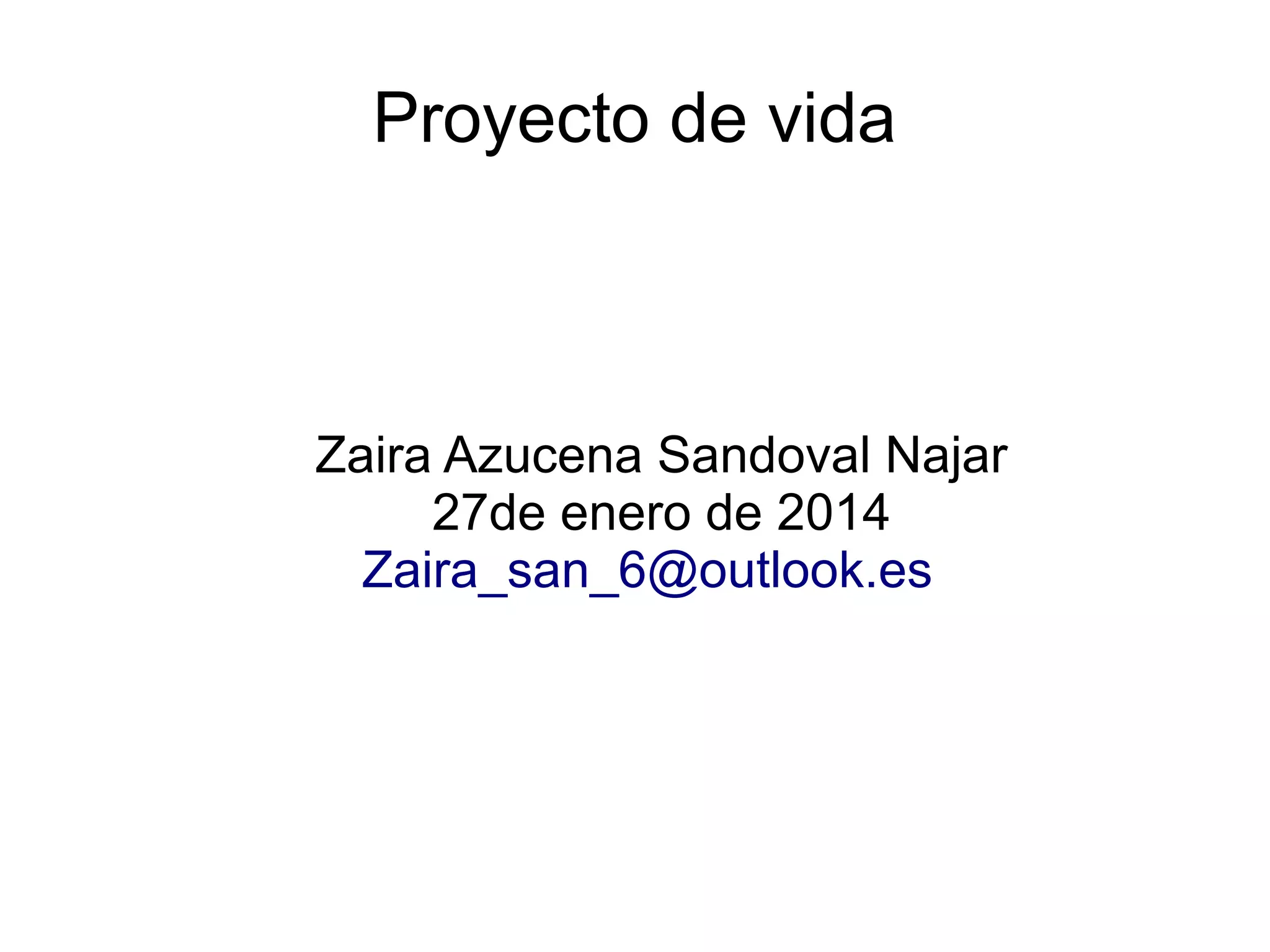 Zaira Azucena Sandoval Najar describe su proyecto de vida, que incluye terminar su carrera en nutrición para ayudar a otros a llevar una buena alimentación y a su familia, ser una gran nutrióloga de la que sus padres se sientan orgullosos, y lograr sus metas profesionales y personales a corto y largo plazo como ayudar a sus compañeros y conocer diferentes lugares del mundo.