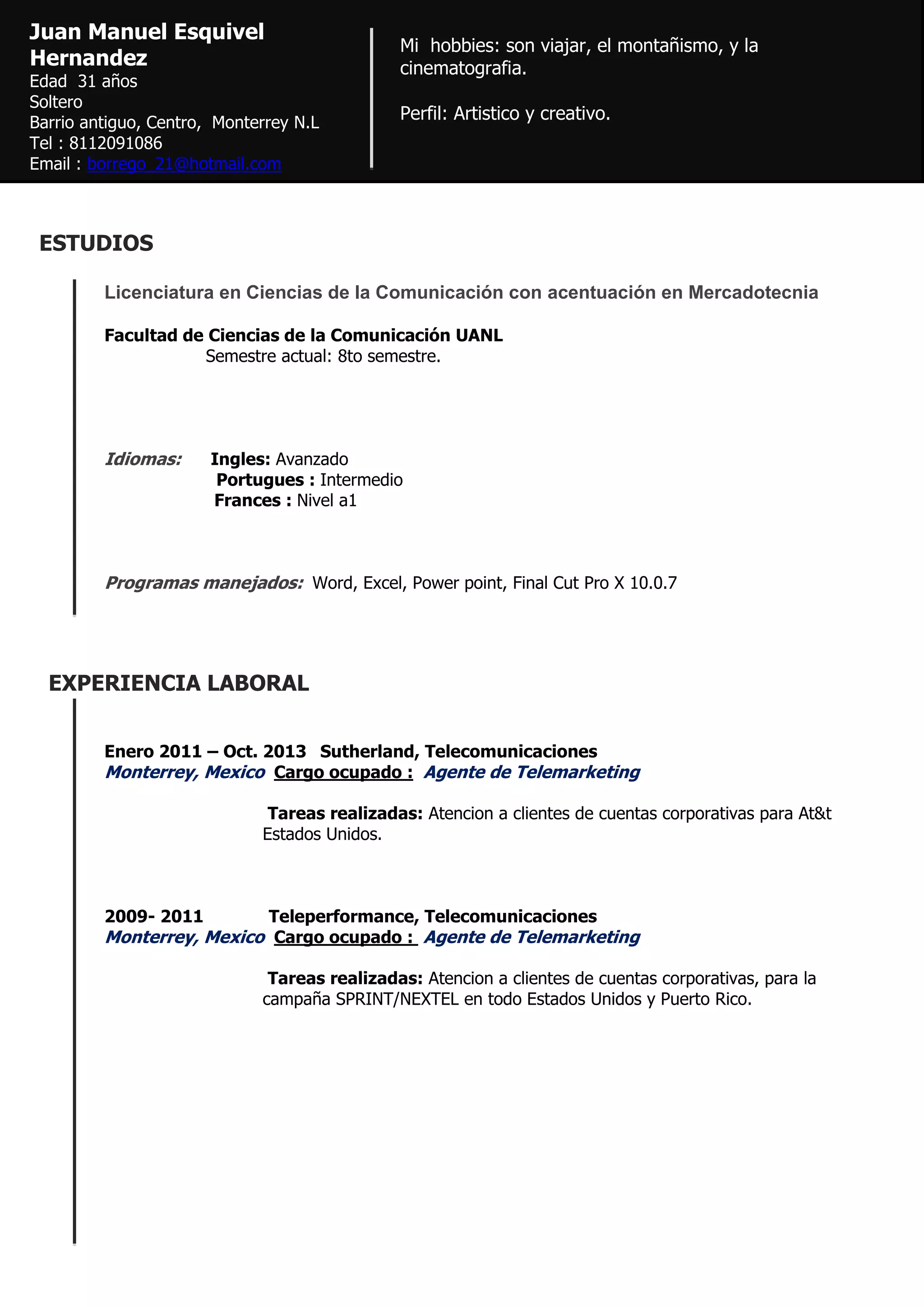 Juan Manuel Esquivel Hernández es un estudiante de 31 años soltero de la carrera de Ciencias de la Comunicación en la UANL. Sus hobbies incluyen viajar, montañismo y cinematografía. Ha trabajado como agente de telemarketing para Sutherland y Teleperformance atendiendo cuentas corporativas en Estados Unidos.
