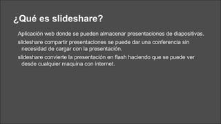 Slideshare es una aplicación web que permite almacenar y compartir presentaciones de diapositivas. Los usuarios pueden subir presentaciones en formatos como PowerPoint, OpenOffice y PDF con un tamaño máximo de 100MB. Esto permite dar conferencias en línea sin necesidad de cargar la presentación físicamente y compartirla fácilmente con otros. Slideshare tiene ventajas como permitir el envío de presentaciones pesadas y visualizarlas desde cualquier computadora con internet, pero también tiene desventajas como que las presentaciones son estáticas sin animaciones y a veces hay incompatibil