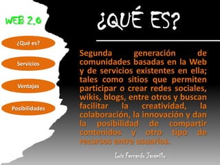 El documento describe Web 2.0, la segunda generación de servicios y comunidades en la web que facilitan la creatividad, colaboración e innovación entre usuarios a través de blogs, wikis, redes sociales y otros servicios que permiten compartir contenido. Ofrece ventajas como software gratuito, acceso desde cualquier lugar y dispositivo, actualizaciones automáticas, menor requerimiento de hardware y colaboración en línea entre múltiples usuarios. También presenta las posibilidades de que los usuarios se conviertan en protagonistas activos, creen y clasif