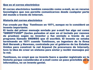 El correo electrónico fue creado por Ray Tomlinson en 1971 para permitir la comunicación a través de la red ARPANET. Tomlinson incorporó el uso de la arroba para dividir la parte del usuario de la dirección de correo electrónico. El correo electrónico ahora es un estándar global para la comunicación que ofrece ventajas como rapidez, bajo costo y capacidad de enviar mensajes a múltiples destinatarios de forma simultánea.