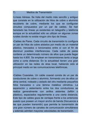 Este documento describe diferentes medios de transmisión de datos, incluyendo líneas aéreas, cables de pares, cables coaxiales, radioenlaces, fibra óptica y satélites. También describe diferentes tipos de redes según el espacio físico que cubren, como redes globales, de área local y de campo privado. Finalmente, clasifica las redes según su accesibilidad, como redes abiertas y cerradas.