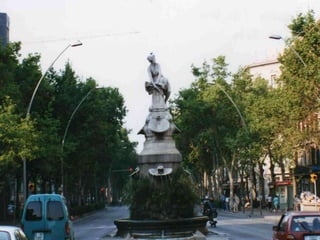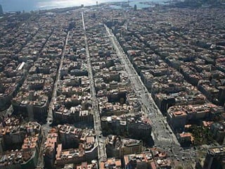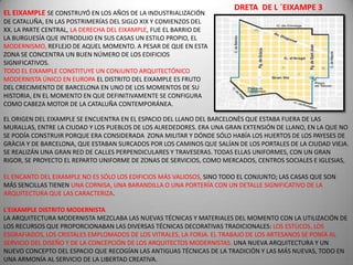 El documento describe varios edificios modernistas ubicados en el barrio de L'Eixample en Barcelona. Entre ellos se encuentran Can Serra, Palau Montaner, Casa Thomas, el Conservatorio Municipal de Música, el Mercado de la Concepció, la farmacia Nordbeck y varias tiendas con fachadas modernistas. También menciona la Torre de les Aigües, un patio interior convertido en playa urbana durante el verano, y el Taller Masriera con su fachada inspirada en el estilo clásico.