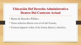 Este documento resume los principales conceptos del derecho administrativo, incluyendo su ubicación dentro del contexto actual como rama del derecho público, la función administrativa del estado, el orden normativo administrativo y sus fuentes, la naturaleza jurídica de los actos administrativos, y varios principios clave como legalidad, debido procedimiento e imparcialidad.