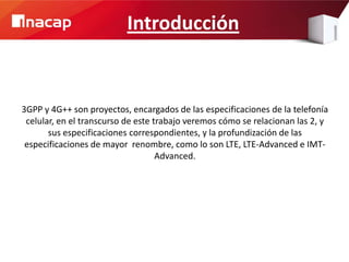 3GPP y 4G++ son proyectos encargados de las especificaciones de telefonía celular. 3GPP desarrolla y mantiene el sistema global de telecomunicaciones móviles, incluyendo LTE y LTE-Advanced. IMT-Advanced establece requisitos como velocidades de 100 Mbps en movimiento y 1 Gbps fijo, eficiencia espectral de hasta 3 bps/Hz, y conectividad mundial a través de múltiples redes. LTE es la interfaz radioeléctrica de 4G basada en OFDMA, mientras que