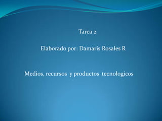Este documento presenta información sobre medios, recursos y productos tecnológicos para la enseñanza, incluyendo medios didácticos pre-tecnológicos y tecnológicos, así como servicios que ofrece Internet y riesgos de su uso ineficiente. También incluye recomendaciones para docentes y padres sobre el uso seguro de Internet.
