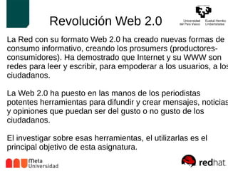 Este documento presenta un curso sobre periodismo y la Web 2.0. Se introducen conceptos clave como prosumers, redes sociales y periodismo participativo. Los temas del curso incluyen archivos audiovisuales, blogs, redes sociales, contenido generado por usuarios y bases de datos con recursos de la Web 2.0. Se proporcionan referencias bibliográficas sobre periodismo ciudadano y herramientas de la Web 2.0 para periodistas.