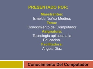 Este documento presenta información sobre componentes y partes de una computadora. Explica que una computadora está compuesta de hardware y software. El hardware incluye partes como el monitor, placa base, CPU, memoria RAM, tarjetas de expansión y fuente de alimentación. También describe periféricos como el teclado, ratón, unidad óptica y disco duro. El documento resalta la importancia de la computadora en la educación y cómo los maestros pueden usarla como una herramienta didáctica efectiva.