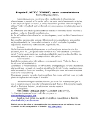 Este documento describe un proyecto piloto para comunicarse con los padres de pacientes a través de correo electrónico en lugar de solo citas en persona. El proyecto tiene como objetivo cuantificar el número y tipo de consultas y el grado en que se resuelven los problemas planteados. El correo electrónico permitirá una comunicación más rápida con los padres y su mayor participación en el proceso de atención médica de sus hijos.