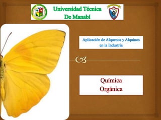 El documento discute la aplicación de alquenos y alquinos en la industria, destacando que son tóxicos y contaminantes si se desechan en la tierra o ríos. Los objetivos son investigar su uso industrial, comprender su formación, mejorar el impacto ecológico de las industrias y delimitar los daños de un derrame tóxico, con el fin general de asegurar un correcto control de desechos.