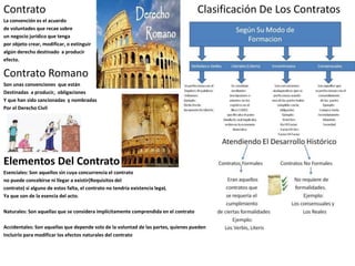 Este documento clasifica y explica los diferentes tipos de contratos. Define un contrato como un acuerdo de voluntades que crea, modifica o extingue derechos. Explica que los contratos romanos son convenciones destinadas a producir obligaciones reconocidas por el derecho civil. Además, detalla los tres elementos de un contrato: esenciales, naturales y accidentales.
