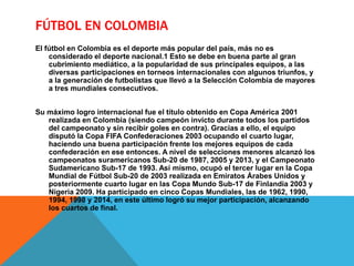 El fútbol es el deporte más popular en Colombia. La selección nacional ha participado en cinco Copas Mundiales y obtuvo su mayor éxito al ganar la Copa América en 2001 como país anfitrión. Los equipos profesionales más exitosos son Atlético Nacional y Millonarios con 14 títulos cada uno.
