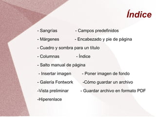 Este documento proporciona instrucciones sobre cómo utilizar varias funciones en OpenOffice Writer, incluyendo cómo aplicar sangrías y márgenes, agregar encabezados y pies de página, dividir el texto en columnas, insertar imágenes y guardar archivos en formato PDF. Explica cómo formatar títulos, agregar índices, realizar saltos de página manuales y crear hipervínculos.