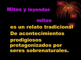 El documento presenta información sobre mitos, leyendas y personajes legendarios de México. Explica brevemente que un mito es un relato tradicional sobre seres sobrenaturales, mientras que una leyenda es una narración oral o escrita que pretende ser verdadera. Luego describe a La Llorona como un personaje legendario mexicano que representa a una mujer que perdió a sus hijos y ahora llora erráticamente en su búsqueda. También menciona a La Madre del Agua, una ninfa acuática con apariencia de