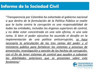 El documento resume los esfuerzos del gobierno colombiano y la sociedad civil para combatir la corrupción, incluyendo la creación de una Comisión Nacional Ciudadana para la Lucha contra la Corrupción, el fortalecimiento de los organismos de control como la Procuraduría General y la Contraloría General, y el desarrollo de herramientas como un sistema unificado de denuncias y un observatorio anticorrupción. Sin embargo, se necesita más recursos y reglamentación para implementar efectivamente estas medidas, así como mejorar la participación ciudadana a trav
