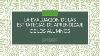 Este documento discute la evaluación de las estrategias de aprendizaje de los estudiantes. Explica que las estrategias de aprendizaje deben usarse correctamente para saber qué hacer para aprender y controlar el proceso de aprendizaje. También señala que cualquier evaluación de las estrategias de aprendizaje en el aula debe proporcionar información sobre el conocimiento conceptual, procedimental y estratégico. Además, para aplicar estas estrategias de evaluación, los maestros deben adaptarse al estilo de aprendizaje de cada estudiante